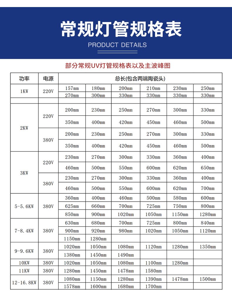 這款UV燈管專為各行業(yè)打造。主波峰310nm-410nm、功率400W-18kw、長度120mm-1179mm、管徑Φ22.5mm-Φ25mm皆可定制。220V-380V供電,純鎢電極,800-1000h質保。能滿足